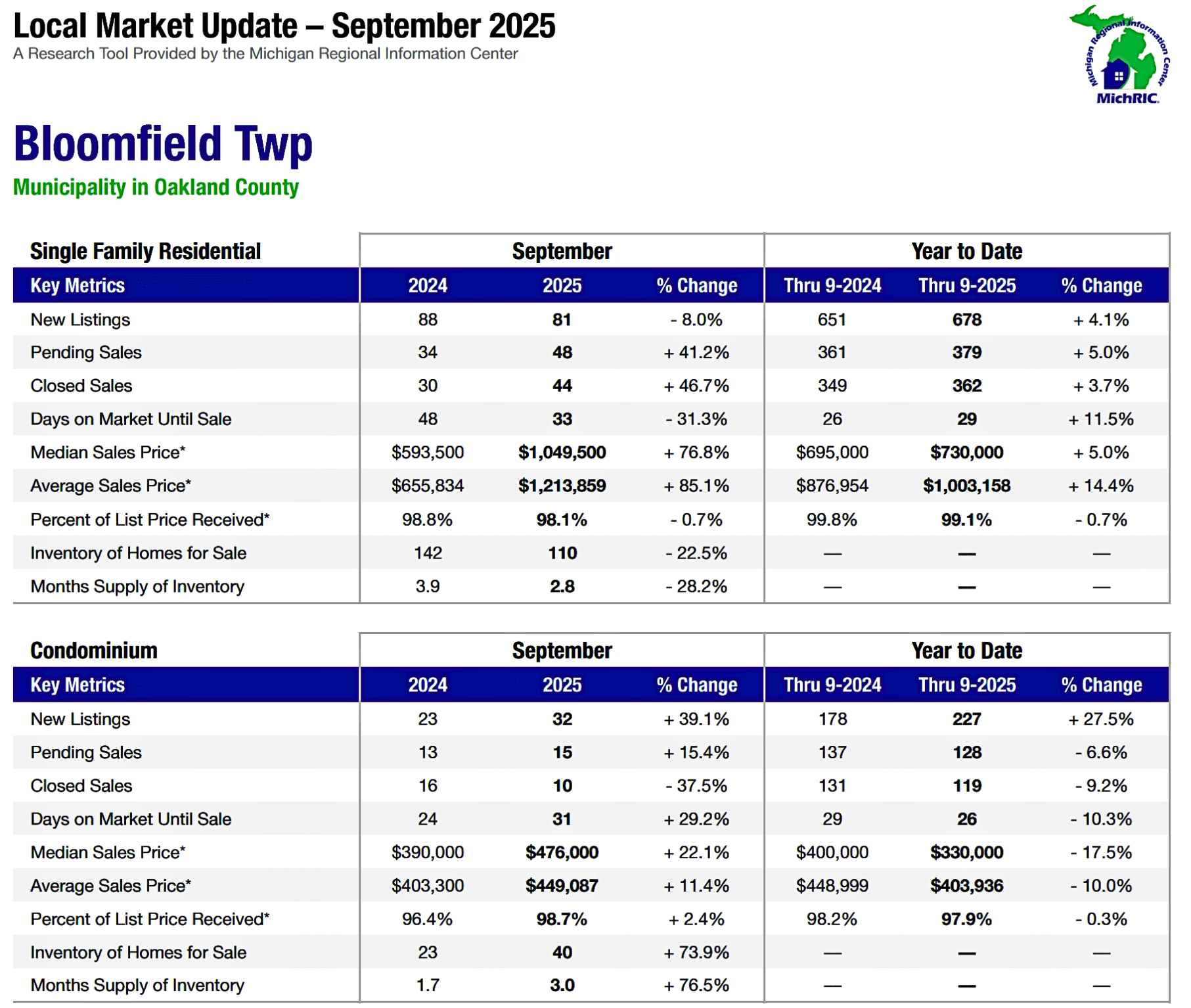 Bloomfield Twp MI Home Prices & Real Estate Trends ~ October 2025