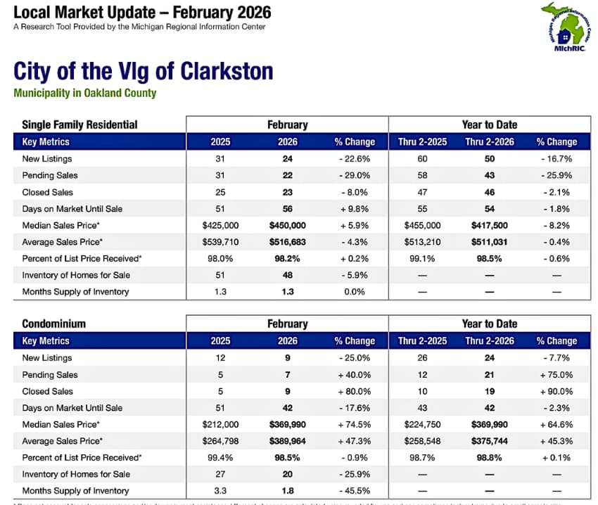 Clarkston MI Housing Market Trends ~ March 2026
