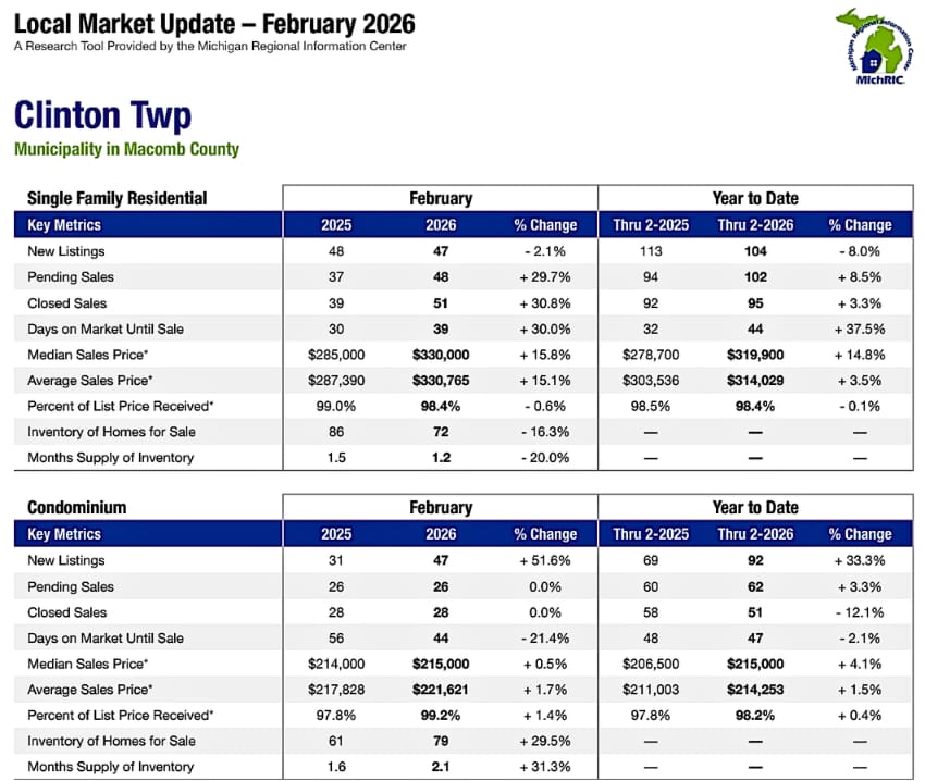 Clinton Twp MI Housing Market Trends ~ March 2026