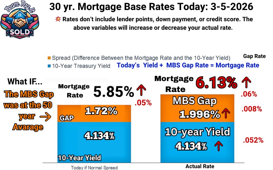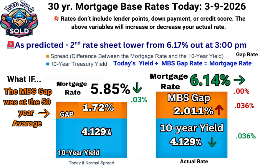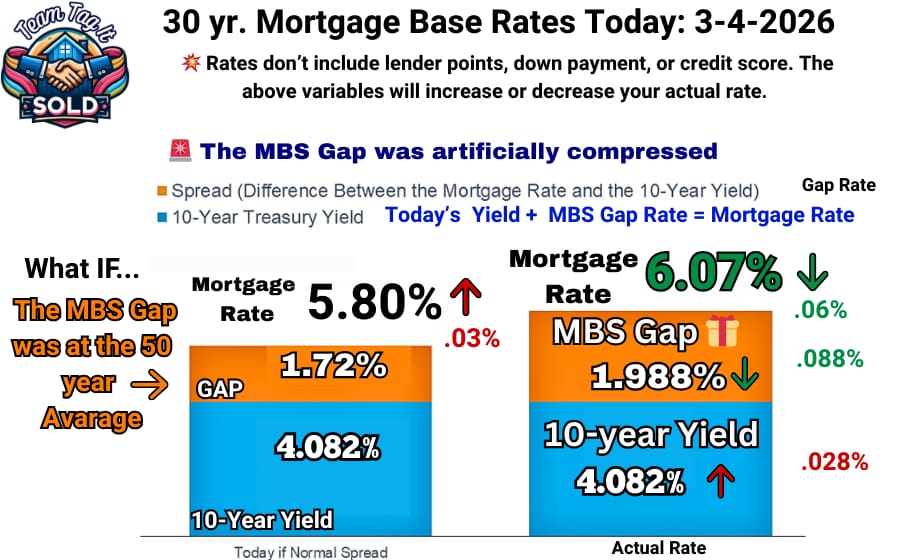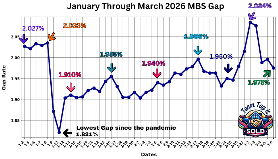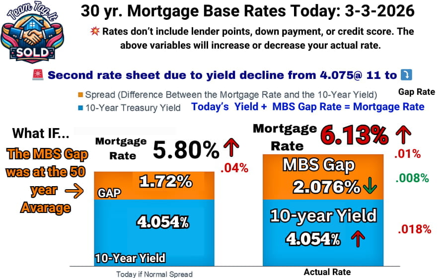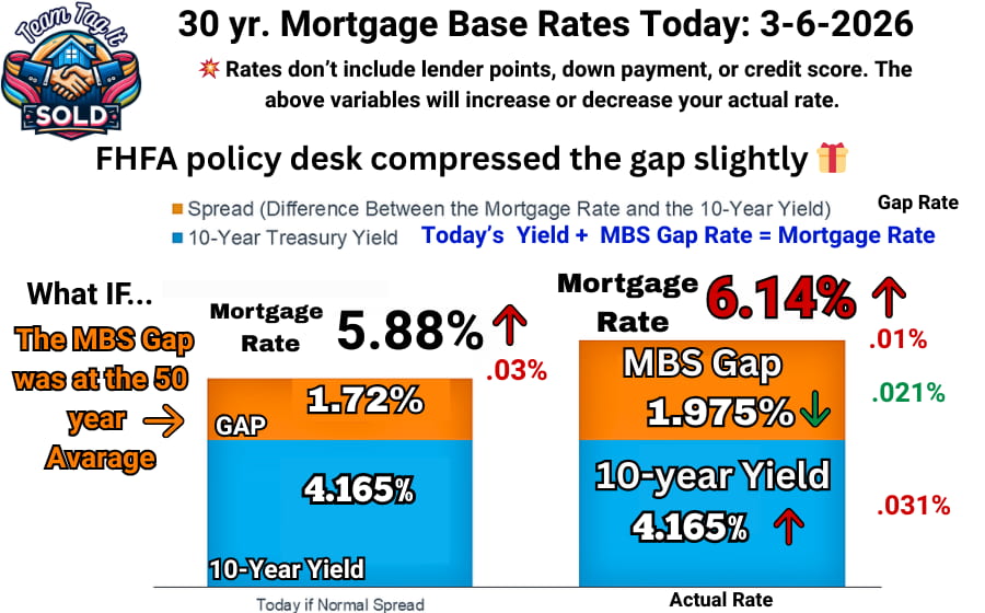 Today, the math didn’tt apply. The FHFA policy desk gave you a gift 🎁 today. Even though the UMBS 5 prices decreased, they compressed the gap anyway. Today’s main reason for the compression: unemployment rose to 4.4%, and December job openings (2 months behind due to the shutdown) plummeted. Investors are reading the job market as a definite wobble, the Iran conflict, SCOTUS overturning the high tariffs, and the Street investors are betting on an interest rate cut sooner rather than later. Now, next week could flip again and jump due to the Treasury bond auction. So the best way to describe the market is VOLATILE. 👿