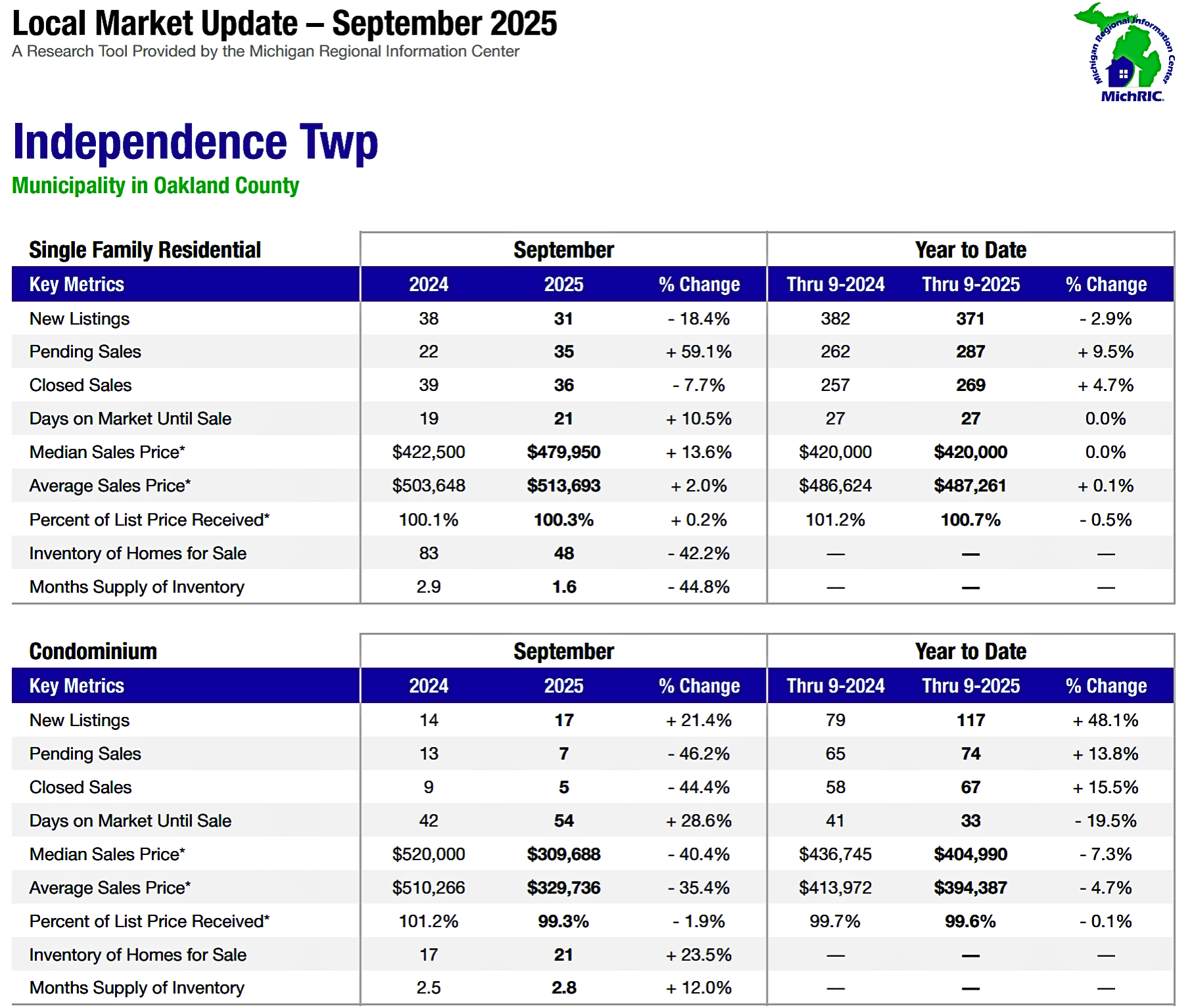 Independence Twp MI Home Prices & Real Estate Trends – October 2025