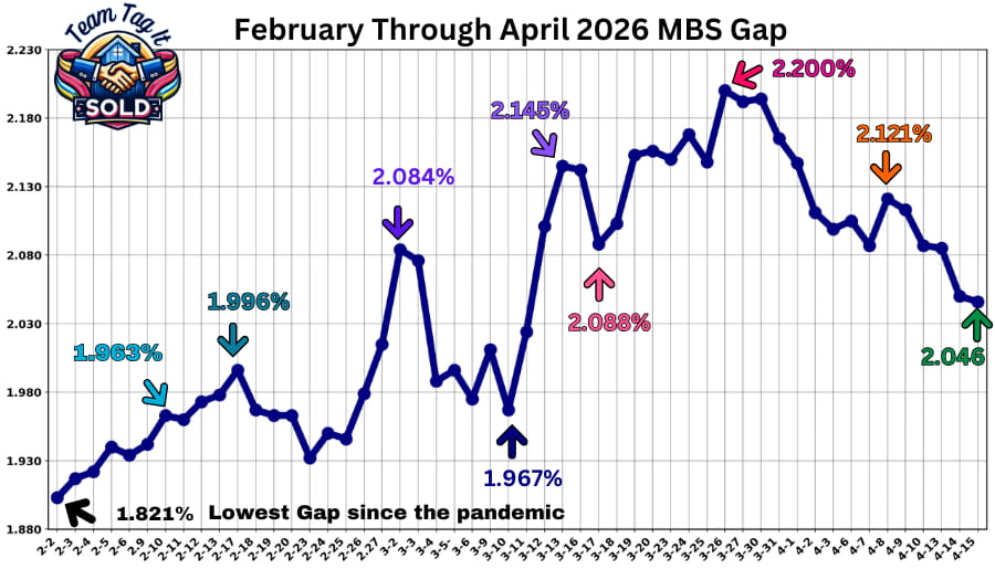 We are now at a turning point in the housing market and will see a shift in 2026. Tracking Mortgage Rates, the 10-year Treasury Yield, the MBS gap, and home prices will determine your mortgage payment. This is the most critical puzzle piece to know if mortgage rates are trending up or down. Let’s review what we do know. Goal # 1 is to see the MBS gap rate stay below the gap rate of 2.025% and work it way back to the 50+ year average of 1.72%. As you can see from the graph, we were heading in the right direction.