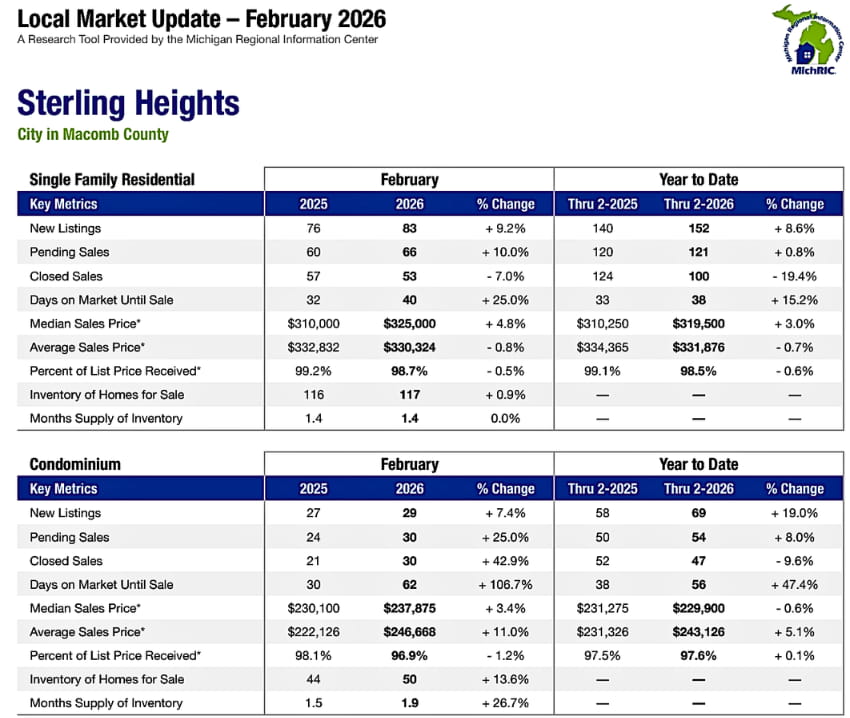 Sterling Heights MI Housing Market Trends ~ March 2026