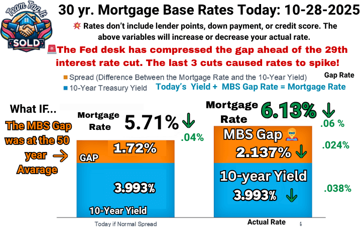 Markets are now pricing in a 0.25% Fed rate cut, lowering the federal funds rate to roughly 3.75–4.00%. When the Fed signals easier policy, bond yields usually retreat—and mortgage rates follow. BUT, the last three interest rate cuts caused the 10-year yield to surge. The Fed desk has been narrowing the gap to keep rates below 6.25%, but that could change on October 30th. Don’t wait until then to lock your rate.