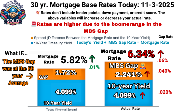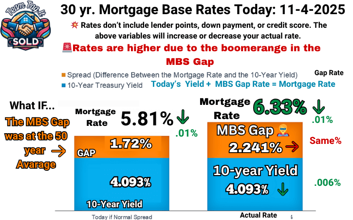🏛️Due to the government shutdown, we are sitting on our hands just like Wall Street. They don’t know how they want to invest, so they’re doing nothing. That’s why mortgage rates haven’t moved much since the spike AFTER the interest rate cuts last month.