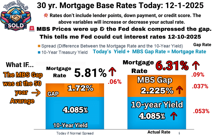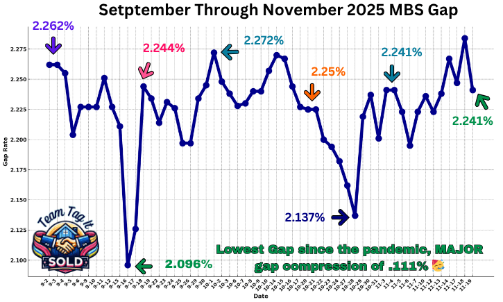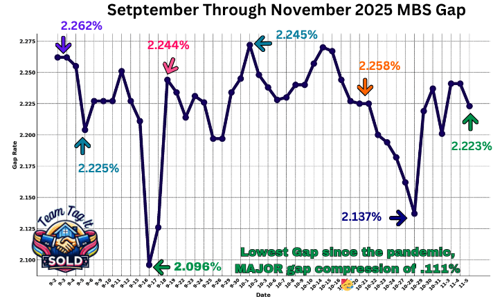📌 The MBS gap has not been following the math since August. 🧮 The Fed desk is determining the outcome of where they want rates to land. We’ve seen huge compressions at .111%, and mortgage rates plummeted to 6.13%. Two days later, a gap correction occurred, and the gap spiked to .148%, resulting in mortgage rates landing at 6.37%. Remember, the Federal Reserve doesn’t determine mortgage rates; instead, the 10-year Treasury yield (set by the Treasury Department) and the Mortgage-Backed Securities (MBS) gap (set by the Federal Housing Finance Agency) do.