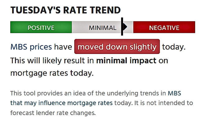 📰 Mortgage Daily News reports that MBS prices have remained the same and could have a minimal impact on Mortgage Rates today. MBS prices from yesterday were at 99.91 and decreased slightly to 99.81 today.