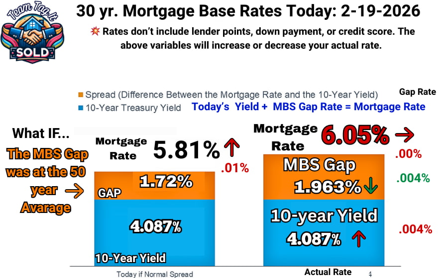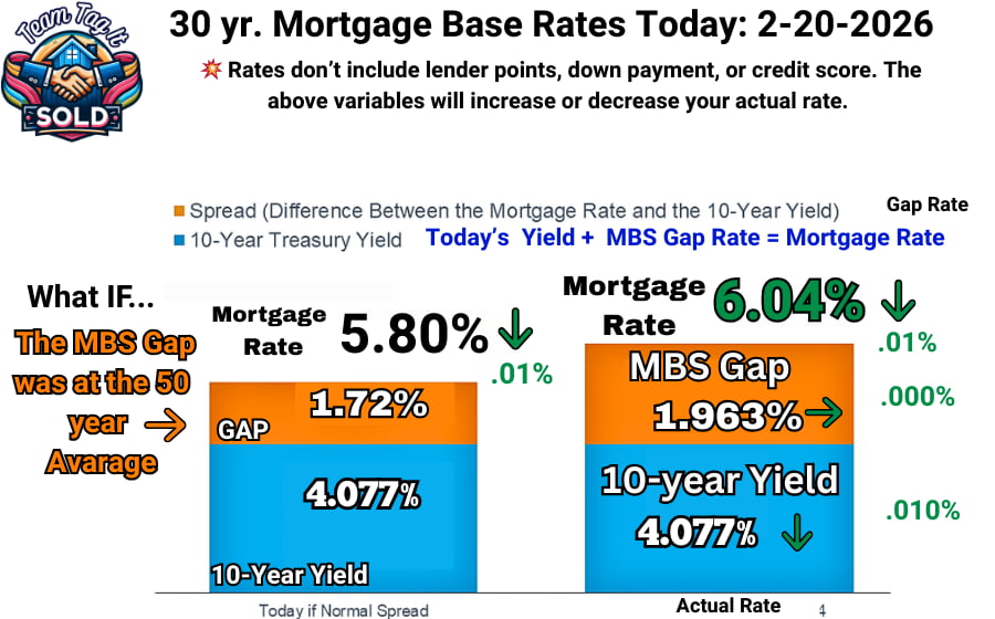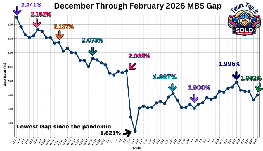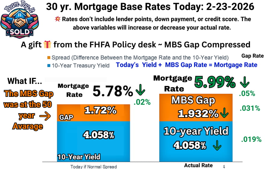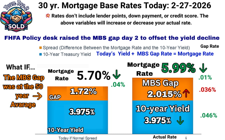 Falling MBS prices mean investors demand higher yields to take on mortgage risk, creating upward pressure on mortgage rates.❌ Result: Lenders increase rates to keep spreads profitable or temporarily pause quoting. Additionally, when the yield skyrockets, 🚀 the Fed Security Desk or Freddie and Fannie 🏦 have been using the gap to correct and stabilize volatility in the Mortgage market. Buyers lose buying power, and the urgency to lock on a dip becomes critical. Today’s Math: FHFA policy desk may start balancing the GSE books now that the yield is starting its trend down. Remember, the FHFA policy desk has been artificially compressing the MBS gap to keep rates stable; they may start to ease up.