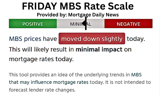 📰 Mortgage Daily News reports that MBS prices have moved down slightly and could have a minimal impact on Mortgage Rates today. 🚨 Due to the FHFA Fed Policies, they are using the MBS Gap balance mortgage rates.