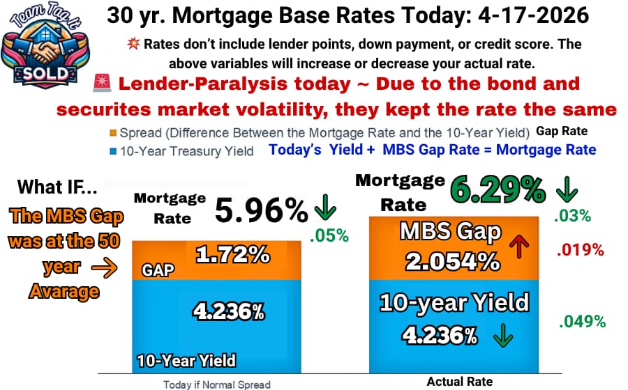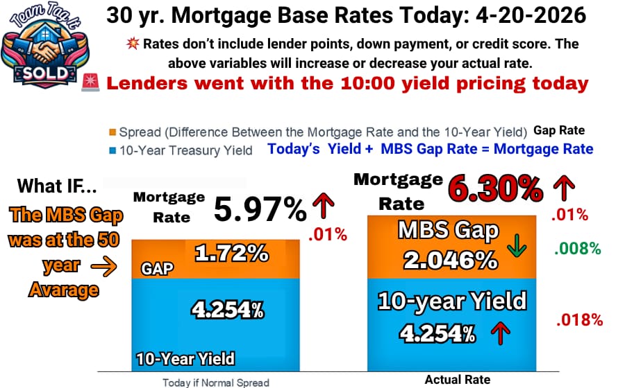 Yesterday, the FHFA Policy desk ignored the 1:00 yield anchor at 4.305% and adjusted the MBS gap lower to keep mortgage rates unchanged, using the 10:30 pricing. Today, the shift is moving in the opposite direction, lower. Watch for the Update and Repricing! ⚠️