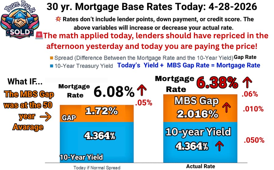 The mortgage rates are late again today. As predicted, the Mortgage Rates landed where the math said they should. It would appear the FHFA policy desk was hoping for a downward drift, but that did not happen. The bond yield has been drifting higher since yesterday, and today it has just set a new ceiling on pricing. WHY? There is no news on a peace plan, the opening of the Straits, or a future negotiation meeting; there is nothing, and Wall Street’s position is “We don’t know what’s happening, so we’re hedging.” Wall Street perceives higher risk, not hope. The headlines are moving faster than Wall Street can determine the risk. Check back to see whether the lender has revised the rates or is ignoring the noise. For the detailed WHY, visit: Crack the Mortgage Rate Code and Save 💲